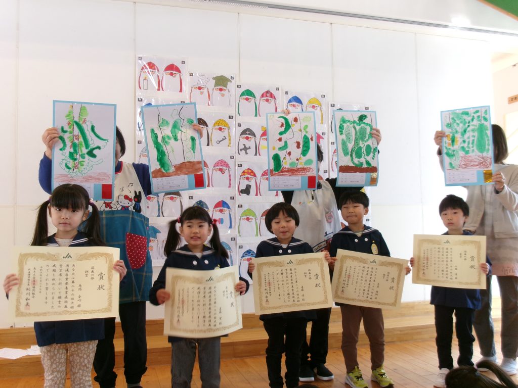 終業式の後に、たくさんの絵画コンクールで頂いた賞状と入選した絵を見ながら賞状の伝達式を行いました。