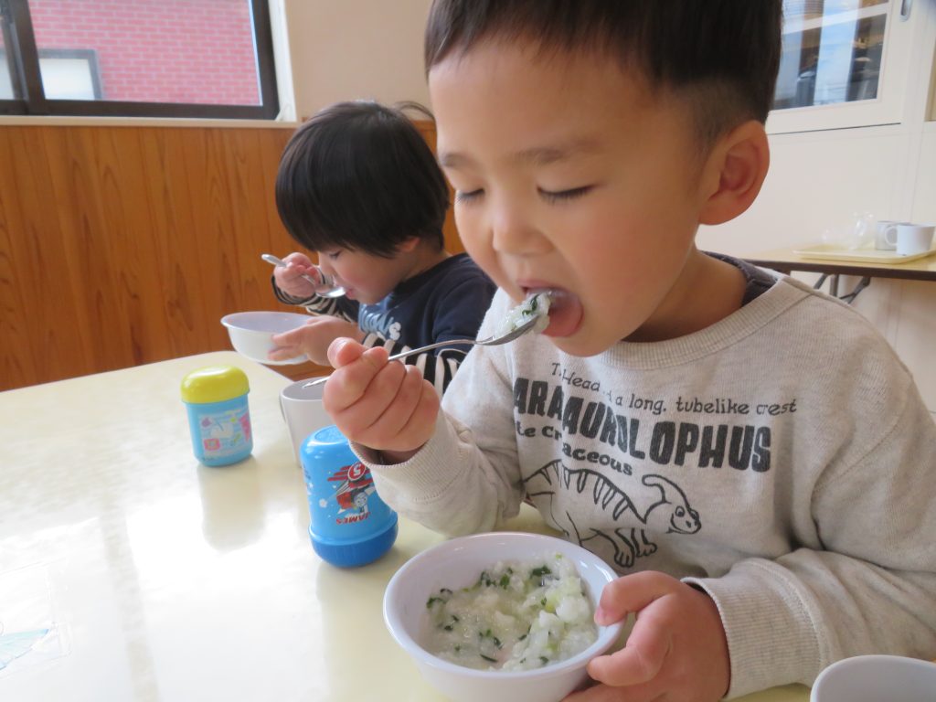 南が丘こども園では、1月7日に「七草がゆ」がおやつに出ました。