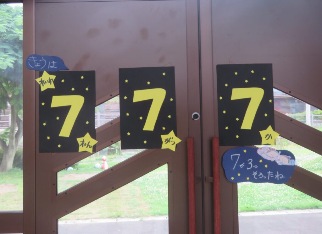 こども園に来ると、玄関にも「7が3つ」そろった日と掲示してあり、