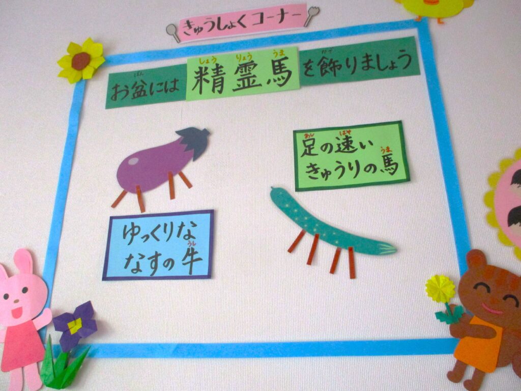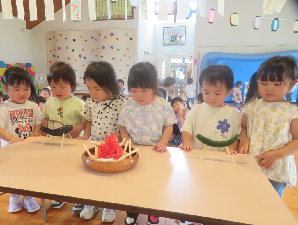 きゅうりの馬「精霊馬」となすの牛「精霊牛」に興味津々な子ども達でした。