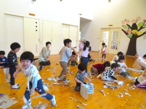 最近は急な雨が降ったと思ったら、おひさまが出てきたりと 不安定な天気が続いて屋外に出れずにいました。 そんな日でも子ども達はホールで 新聞紙を使って思い切り体を動かして遊びます。 だんだん小さくなっていく新聞紙に大盛り上 […]